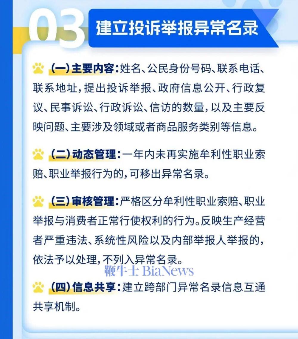 其中的一大亮点是:“经综合研判确属牟利性职业索赔、职业举报行为人的,可以列入本市投诉举报异常名录”。而对于异常人员提出的投诉,相关部门需要严格审查、审慎认定处理,涉及违法犯罪行为的更要予以打击。