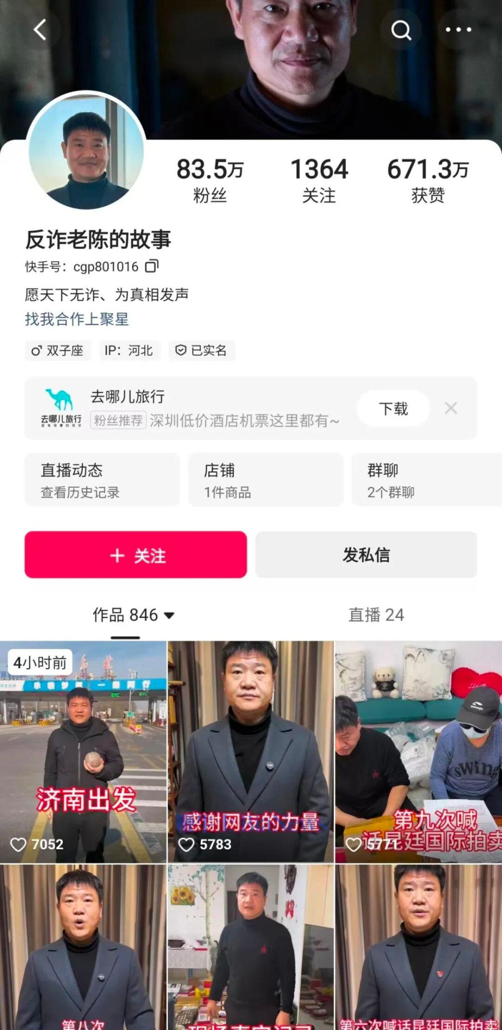 代表性的就比如转型成打假人的“反诈老陈”,今年8月以来相继打假“嘎子哥”“清河李哥”“雪糕姐”等网红,目前其抖音快手总粉丝数超过200万。