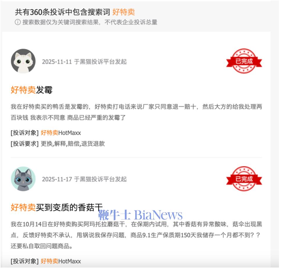 然而,低价策略的背后,品控问题正成为好特卖持续发展的隐忧。在社交媒体上,对于好特卖品控问题的吐槽屡见不鲜,有消费者称“在好特卖肉脯居然有鸡毛”,还有用户则分享了自己“第一次购买就被背刺”的经历,称买到的临期巧克力已严重变质.......