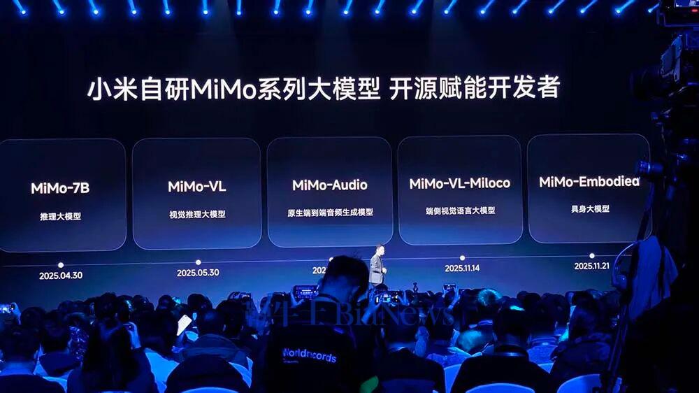 智东西12月17日北京现场报道,刚刚,小米举办了年度“人车家全生态”合作伙伴大会,现场人头攒动座无虚席,展区不少展台都已被围观人群挤满,讨论热度颇高。小米创始人兼CEO雷军此次并未来到现场,小米集团合伙人、集团总裁卢伟冰率先登台演讲,今天第三位演讲的是当前备受关注的原DeepSeek核心成员、被业内称为“天才少女”的罗福莉,她现在的职位是小米MiMo大模型负责人。罗福莉在演讲过程中虽然稍显紧张,但她抛出的海量金句却句句令人印象深刻:·AI正以非线性的方式重演人类大脑6亿年的进化史;·下一代智能体系统不是一个“语言模拟器”,而是一个真正理解我们世界、并与之共存的“智能体”;·相比生物演化的稳固根基,AI的发展是“空中楼阁”;·AI进化的下个起点,一定是有一个能跟物理世界交互的模型;·算力和数据也并非最终的护城河,真正的护城河,是科学的研究文化与方法,是将未知问题结合模型优化转化为可用产品的能力;·开源是实现AGI的普惠化,是确保所有人类的智慧共同进化的唯一路径;在演讲中,罗福莉首次明确解读了小米打造Agent语言基座模型的三个核心方向,解读了新模型背后的多项关键技术突破。对小米如何通向AGI,罗福莉也明确了小米的路径。除了AI大礼包,今天会上,卢伟冰也分享了小米整体业务的诸多亮点。卢伟冰说,2025年是小米“大发展”的一年,今年前三季度,小米收入同比增长32.5%,超过了3400亿元,经调整利润同比增长73.5%,其中手机销量中国市场1-10月排名第二。未来五年,小米集团研发投入预计将超过2000亿元,2026年预计研发投入在400亿左右。小米人车家生态究竟包括什么?卢伟冰这次给出详细拆解:在大家最关心的AI方面,小米自研MiMo系列大模型家族赫然呈现:推理大模型、视觉推理大模型、原生端到端音频生成模型、端侧视觉语言大模型、具身大模型。一个月前的11月12日,罗福莉在朋友圈正式官宣加入小米Xiaomi MiMo团队。就在昨晚,小米刚刚发布了最新的MiMo大模型MiMo-V2-Flash,性能媲美DeepSeek-V3.2,这也是罗福莉加入后MiMo团队亮出的首个新成果。