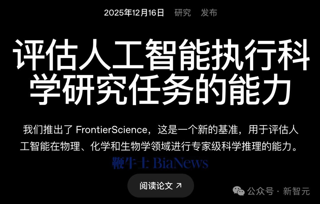 OpenAI在2025年12月16日发布了一套新基准FrontierScience,用来衡量AI在物理、化学、生物三门学科里,能否做到接近专家水准的科学推理,而不只是背知识点。