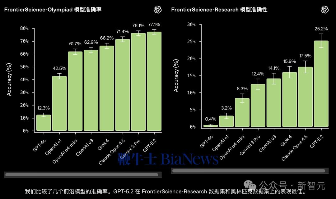 他们评测了GPT-5.2、Claude Opus 4.5、Gemini 3 Pro、GPT-4o、OpenAI o4-mini、OpenAI o3等模型。OpenAI表示,GPT-5.2在竞赛题上得分77%,在研究题上得分25%,目前领先;Gemini 3 Pro在竞赛题上拿到76%,紧跟其后。