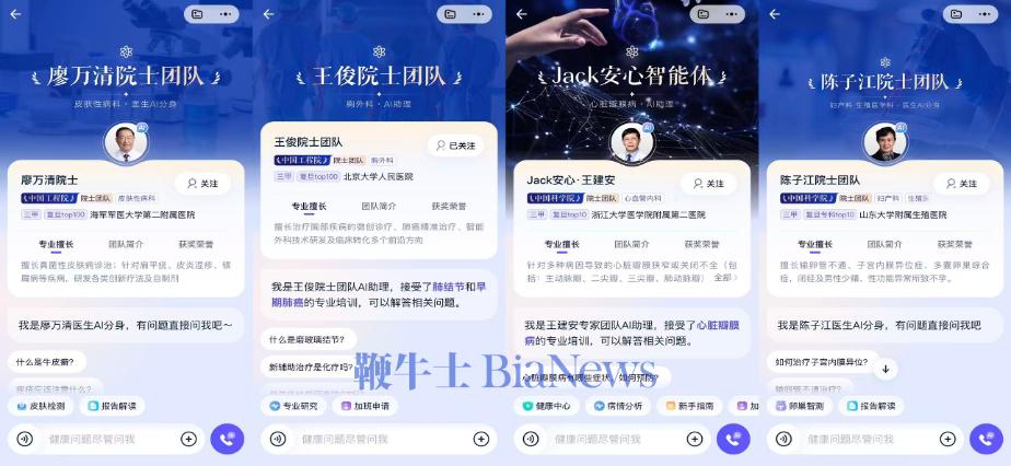 同时,阿福作为平台,还链接了北京大学人民医院胸外科专家王俊,中国皮肤与真菌病领域泰斗级专家廖万清,浙江大学附属第二医院院长王建安,中国科学院院士陈子江等六位国家院士,以及全国500多位名医,开设了自己的“AI分身”,通过数字平台、智能技术,让1个医生变成10个医生,让专业的健康服务更加普惠。