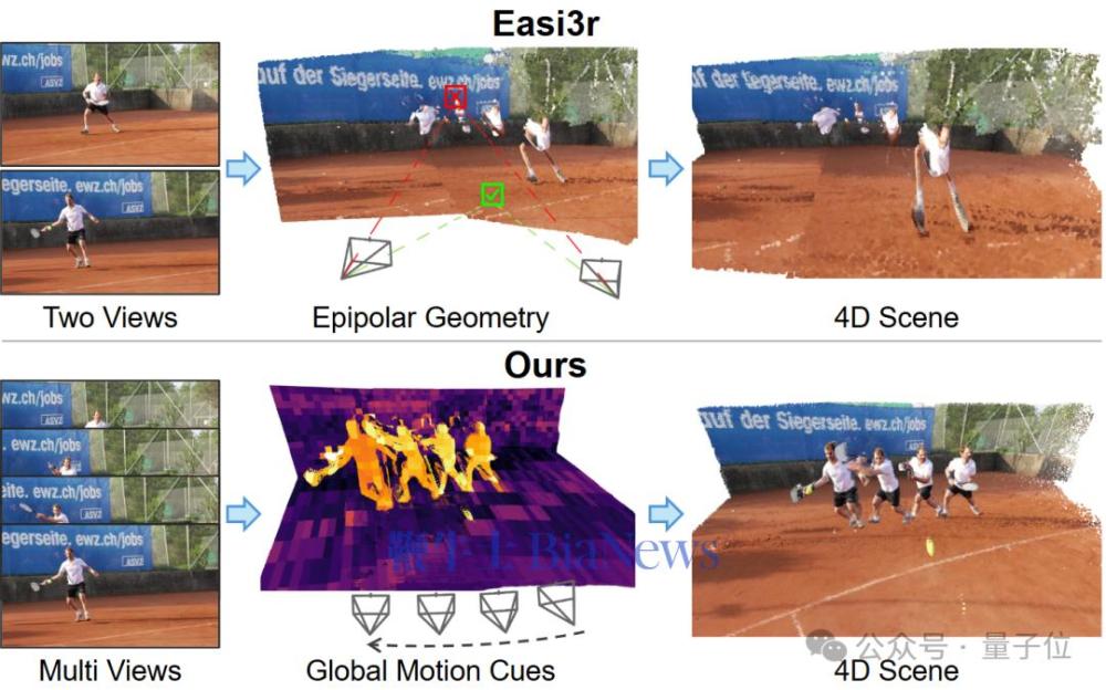 近年来,以VGGT、DUSt3R为代表的3D基础模型在静态场景重建中表现出色。然而,面对包含移动物体(如行人、车辆)的动态4D场景时,这些模型的性能往往显著下降。动态物体的运动不仅干扰背景几何建模,还会导致严重的相机位姿漂移。