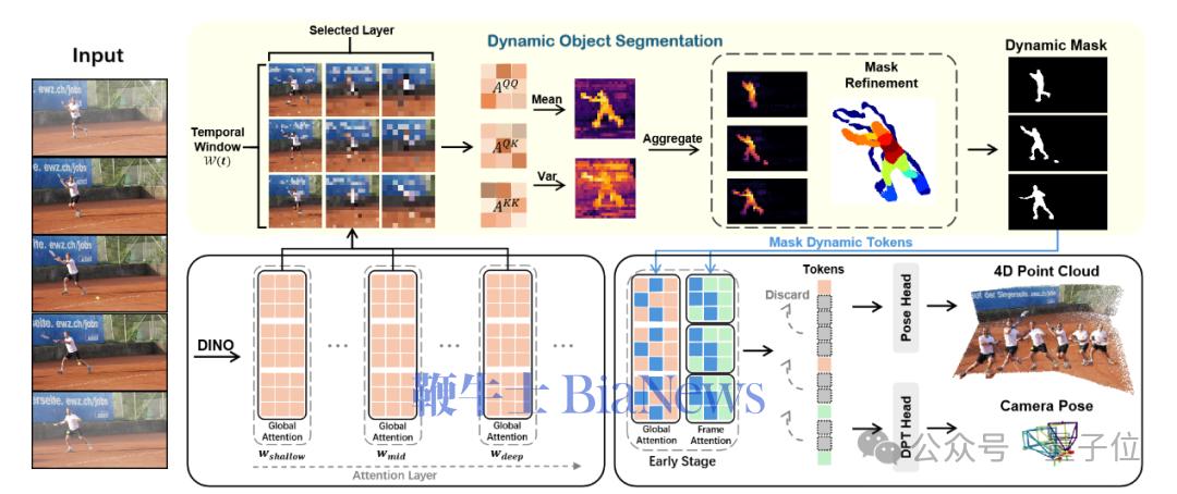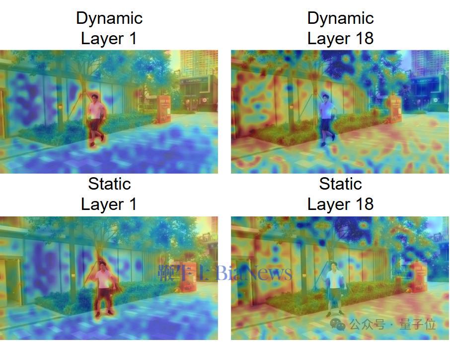 研究人员对VGGT的注意力机制进行了可视化分析,观察到一个关键现象:VGGT的不同网络层对动态区域表现出截然不同的响应模式。