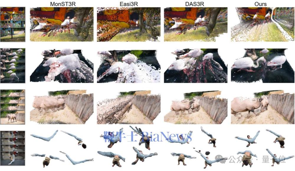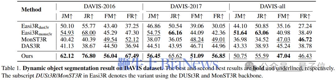 定量分析:VGGT4D显著优于其他所有变体,在DAVIS-2016和DAVIS-2017数据集上均达到了最优性能。值得强调的是,即使没有经过任何4D特定的训练,该方法仅基于预训练的VGGT模型即可取得优异结果。虽然Easi3Rmonst3r在DAVIS-all数据集上表现出具有竞争力的召回率,但这主要得益于MonST3R在光流上的后训练,而VGGT4D无需训练。