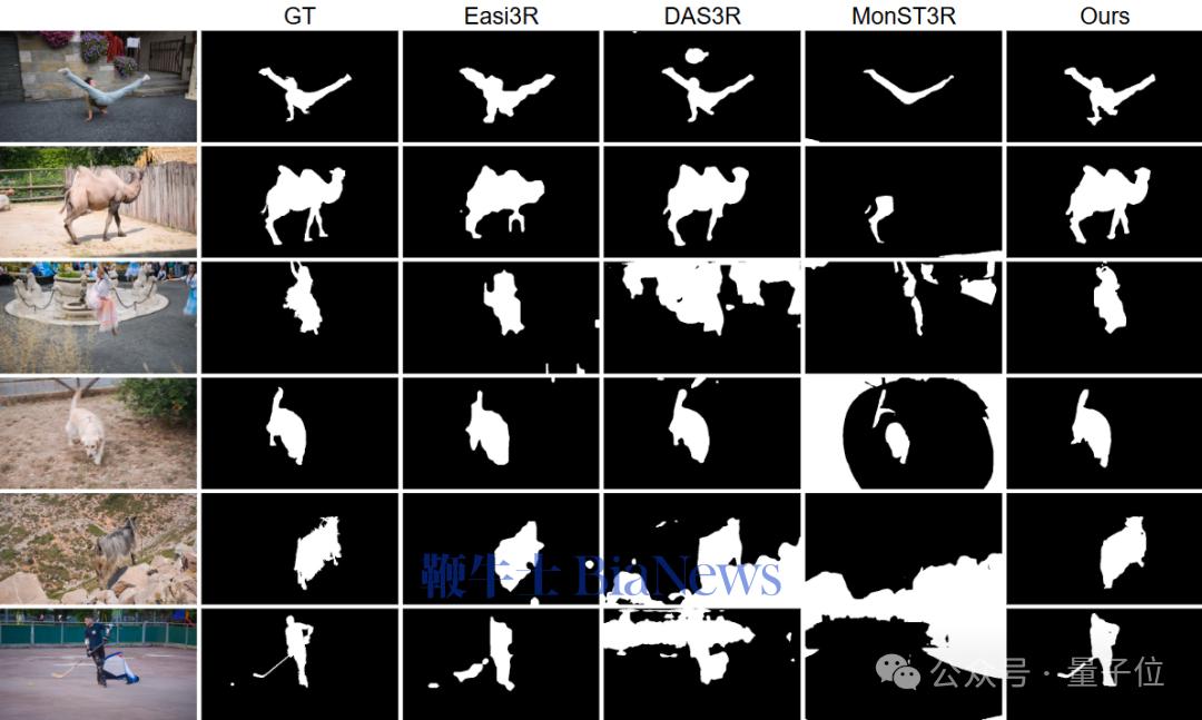 定性分析:定性结果清晰地展示了基线方法的不足:Easi3R的掩码较为粗糙且遗漏细节;DAS3R倾向于过度分割并渗入静态背景;MonST3R则常常分割不足。相比之下,VGGT4D生成的掩码更加准确,且边界更加清晰。这些结果有力地验证了研究团队的假设:VGGT的Gram相似度统计信息中嵌入了丰富的、可提取的运动线索。