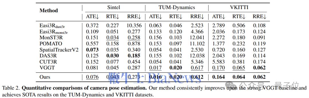 强大的基线与持续改进:数据表明,原始VGGT已经是一个非常强大的基线,其自身就优于MonST3R、DAS3R等许多专门的4D重建方法。这表明VGGT的预训练隐式地使其对动态物体具有一定的鲁棒性。然而,这种鲁棒性并不完美。VGGT4D在所有数据集上均持续改进了这一强大的VGGT基线。例如在VKITTI数据集上,VGGT4D的ATE仅为0.164,而MonST3R高达2.272。