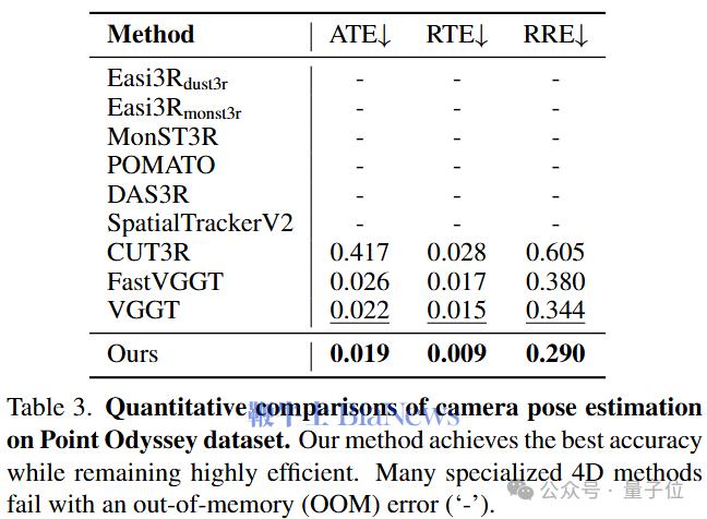 长序列鲁棒性突破:在极具挑战性的长序列Point Odyssey基准测试中,VGGT4D在所有指标上均取得了最佳结果,同时保持了高度效率。许多其他4D方法由于内存不足(OOM)错误甚至无法在该500帧序列上运行。这表明VGGT4D提出的显式、无需训练的动态-静态分离方法成功地识别并消除了由运动引起的残余位姿不一致性,从而实现了更稳定、更准确的相机轨迹,尤其是在长且复杂的序列上。