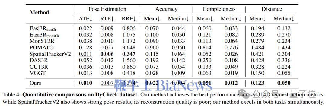 在DyCheck数据集上的评估显示,VGGT4D在所有重建指标(准确度、完整度和距离)上均取得了最佳性能。与VGGT基线相比,中位准确度误差从0.009降低到0.004,平均距离从0.150降低到0.123。这证明了该方法不仅实现了精准的动静分离,更能实质性提升几何重建质量。