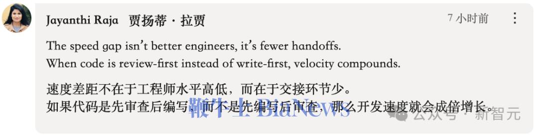比如,有网友提出,在AI编码场景中,如果把审查、判断、设计(通常需要人类完成)前置,然后再让AI编码,就可以成倍提高开发速度。