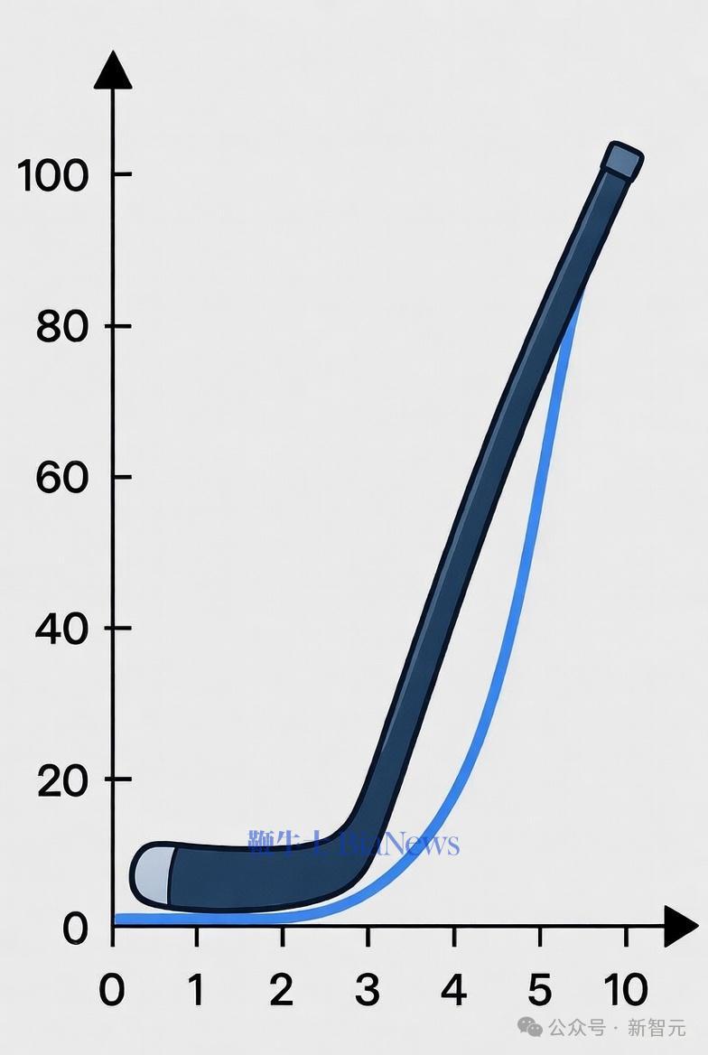 当AI的自动化能力足够强大,就可能实现Embiricos所说的那种「曲棍球杆式增长」:前期几乎平坦,随后突然陡然上升,形状看起来就像一根曲棍球杆。