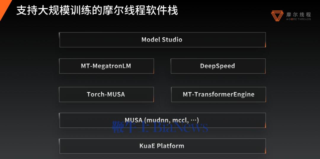 围绕大规模训练,摩尔线程从底层到顶层系统性地研发了软件栈。