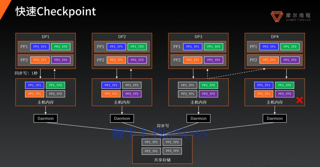 为此,我们实现了异步checkpoint:先将checkpoint写入本地内存,后续再异步写入存储系统,将checkpoint时间压缩到秒级。这么做对于几千亿参数规模的模型来说,checkpoint 写入只需几秒即可,训练可以立即继续执行。