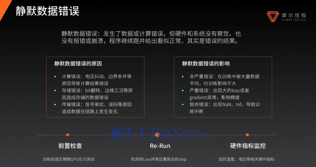 静默数据错误也是一个棘手的问题。与引起训练报错甚至中断的问题不同,静默数据错误不会触发异常,也不会中断训练,数值看起来“正常”,但实际上已经发生错误。造成静默数错误有几种原因,一种是计算硬件有一定的故障率,在一定概率下可能会算错,就会造成静默数据;另外,内存或显存上的ECC特性对性能的影响比较大,在训练的过程可能没有开启;在传输的过程中,也会出现纠错码失效的情况,导致误码没有被发现。