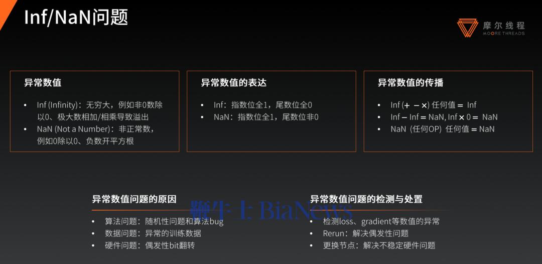 对于轻微的数值错误,在万亿参数规模下往往会被其他数值平均掉,影响不明显,可以继续训练。有一类是严重错误,可能导致Loss值或梯度出现一个非常大的偏差,Loss曲线会出现异常尖峰,频繁出现时会影响模型精度。如果这种问题经常发生,会导致训练精度的下降。还有一种致命错误,数值异常传递并最终导致出现NaN 或Inf,导致训练中断,只能回退到之前的checkpoint进行回训。