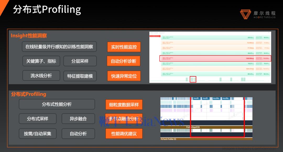 在集群洞察方面,我们会持续监控前向传播和反向传播中的计算和通信时间,慢节点检测正是基于这些数据做的分析。同时,我们引入了更全面的 Profiling 能力,可以在不中断训练的情况下,一键启动或停止性能分析器,按需采集训练数据,并进行火焰图等算子级分析,甚至可以将多个节点的数据汇聚后进行联合分析。