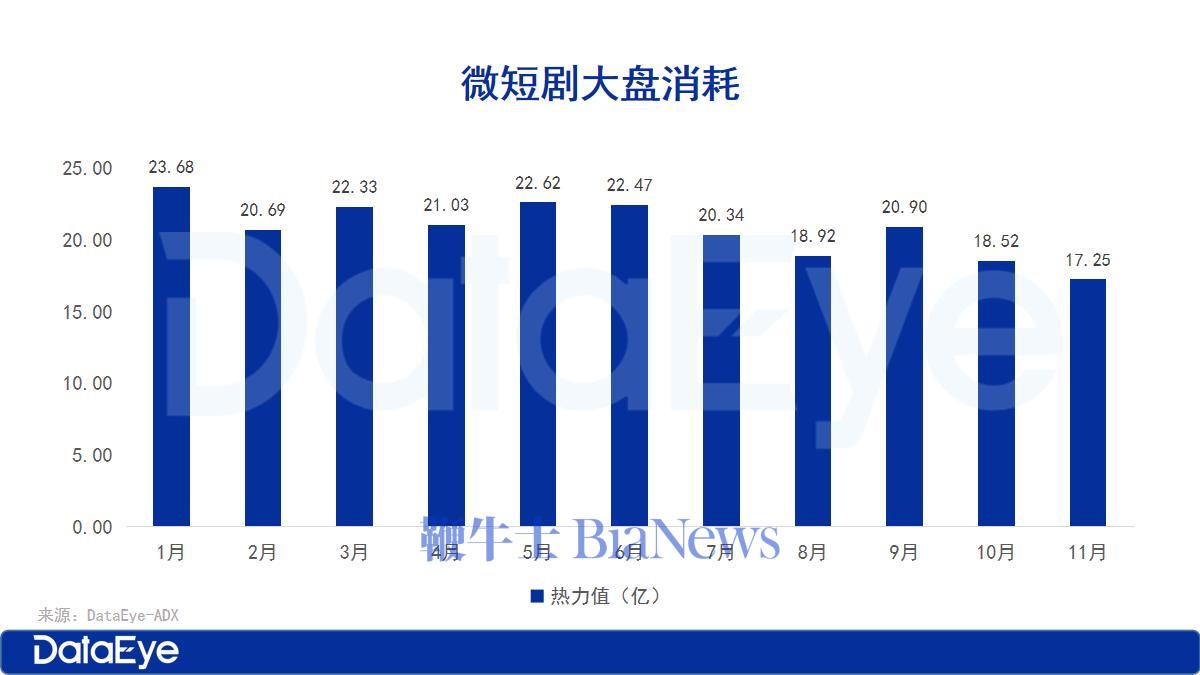 截至2025年11月,本年度微短剧大盘累计热力值为228.75亿,每月平均热力值为20.8亿。近几月,微短剧大盘呈收窄趋势。11月微短剧热力值达17.25亿,较上期下降约7%。
