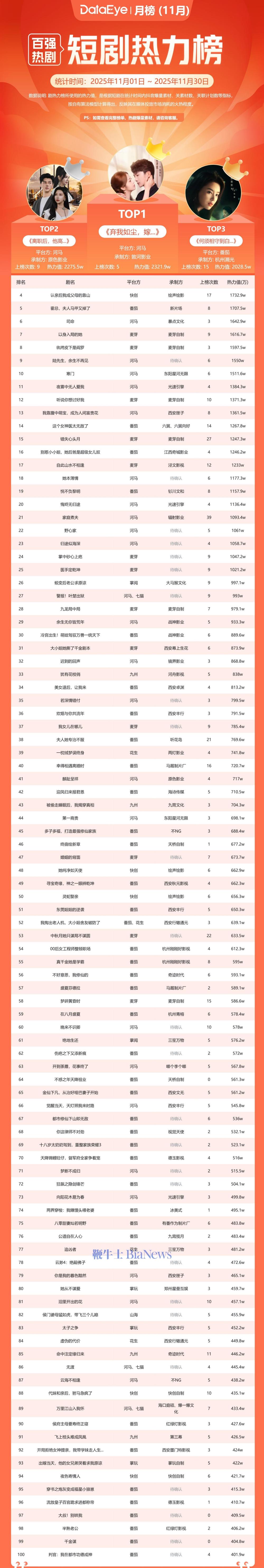 1、11月百强热剧:河马包揽TOP2,新剧数量上涨31%