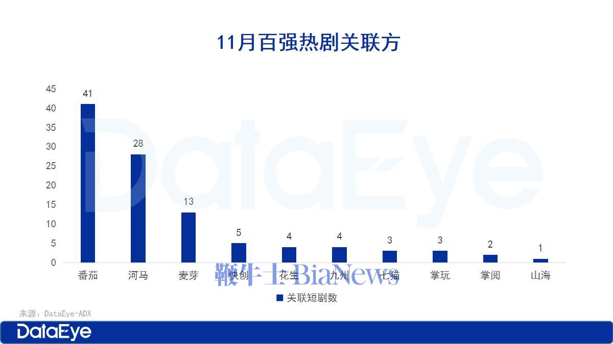 而从百强热剧的关联方来看,本期番茄、河马和麦芽稳居TOP3。番茄遥遥领先,占41席,接近半数份额,较上期下降7席;河马第二,占28席;麦芽位列第三,占13席;快创占5席,花生、九州各占4席。
