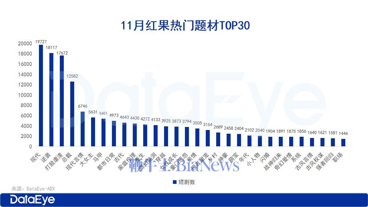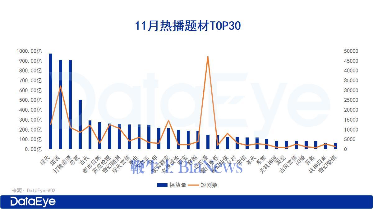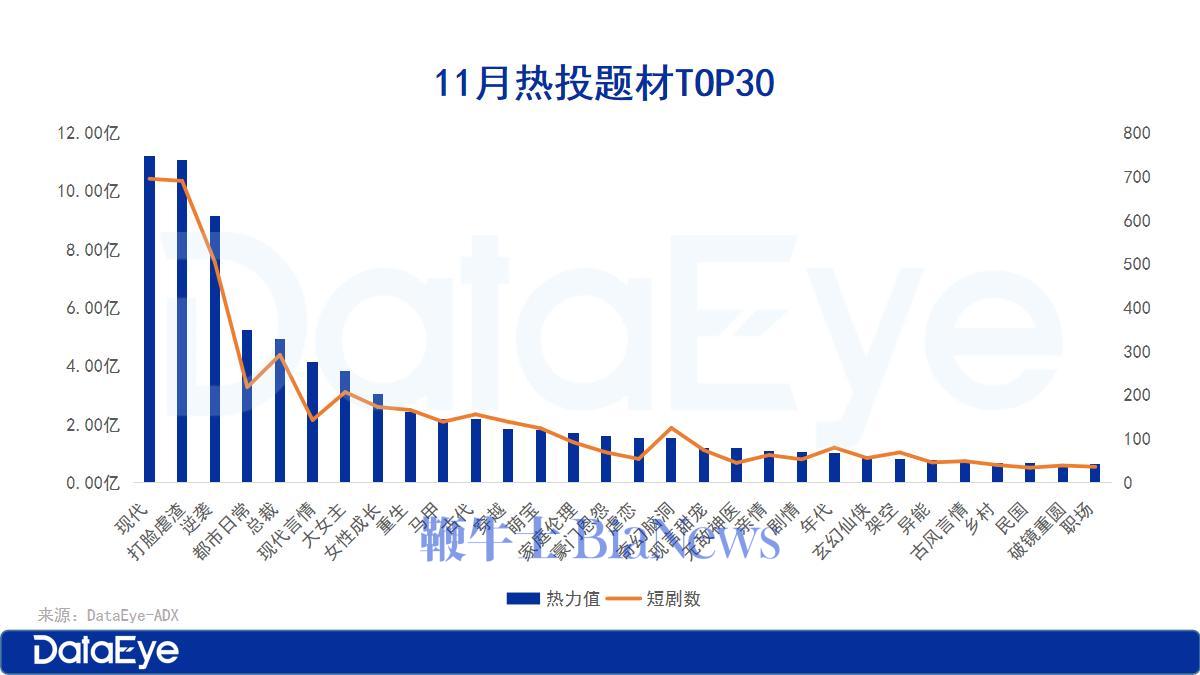 题材方面,11月热投题材中,关联热力值破亿的题材共计22类,较上期提升9类。从关联微短剧数量来看,共有14类题材关联微短剧数破百,较上期提升9类。