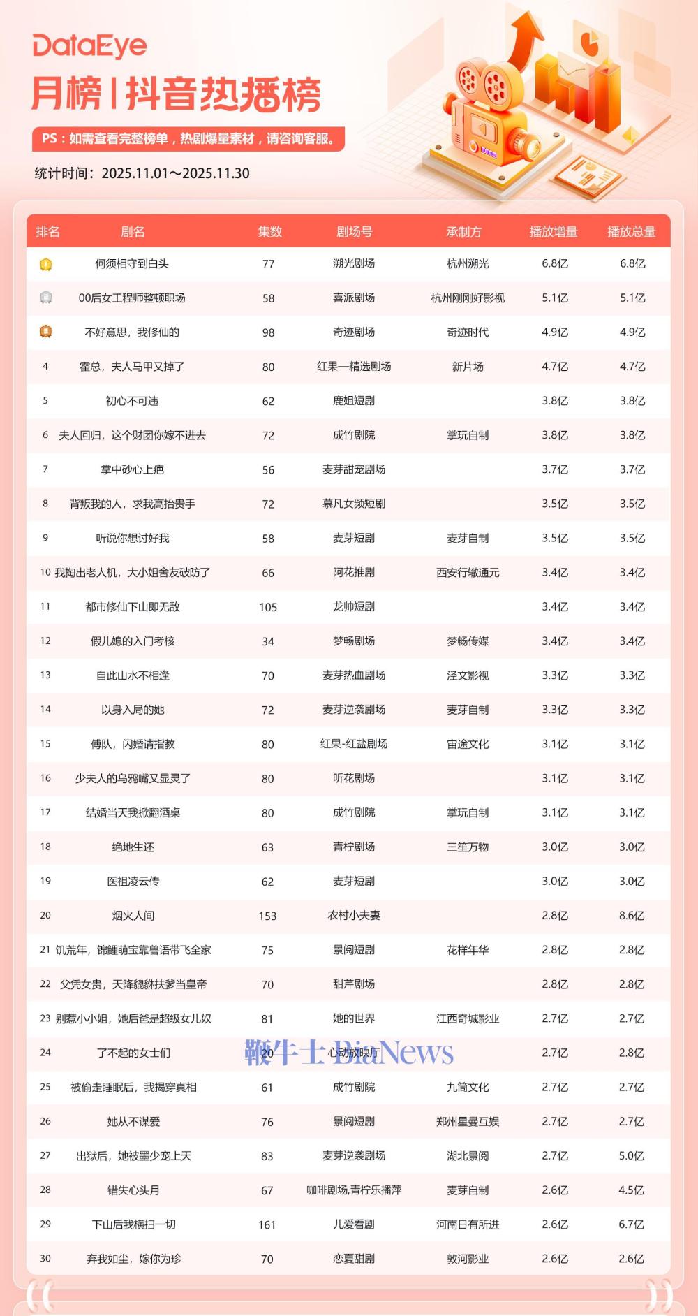11月抖音端原生百强热播剧中,新剧占68部,较上期提升12部,其中有24部闯入TOP30。