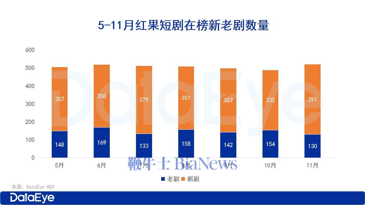 11月,红果短剧在榜剧达521部,数量达今年以来最高值,主要由于新剧数量的提升。本期新剧达391部,占比达75%,数量较上期提升56部。