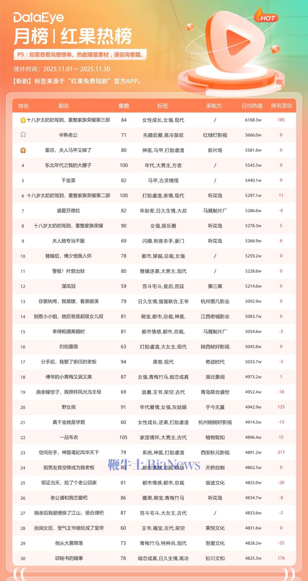 从热度来看,11月红果热榜月榜中,听花岛制作的《十八岁太奶奶驾到,重整家族荣耀第三部》第一,日均热度达6168.3W。《十八岁太奶奶驾到,重整家族荣耀第三部》10月26日上线,于10月28日登顶DataEye红果热榜日榜,热度达1.7亿。本期该剧持续霸榜,于11月1日达到本期热度峰值1.2亿。