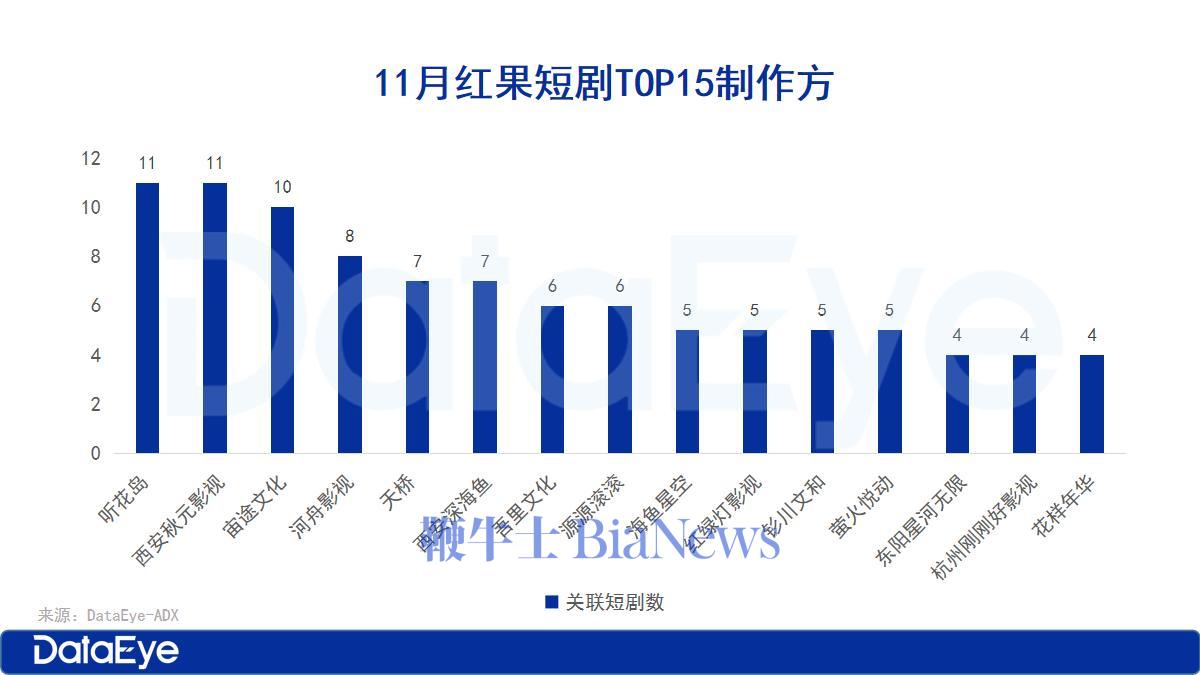 从制作方角度来看,11月,DataEye红果热榜月榜中,西安秋元影视制作的微短剧数有所上涨,与听花岛并列第一,关联微短剧数均达11部;宙途文化位列第二,关联微短剧数为10部;河舟影视占8部,位列第三。