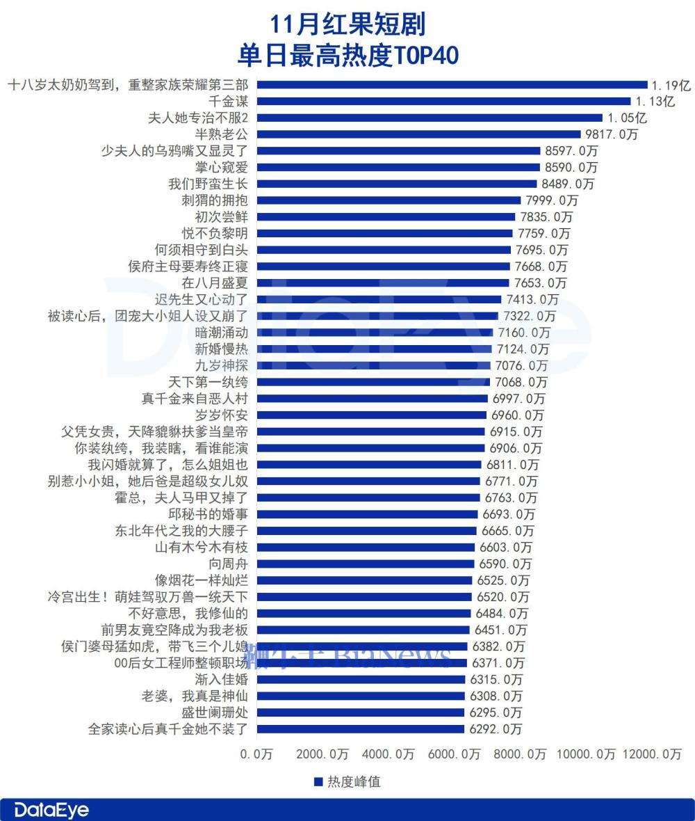 11月上榜的红果微短剧中,共有7部微短剧热度峰值超8000W,3部微短剧热度峰值破亿。3部热度破亿微短剧分别为《十八岁太奶奶驾到,重整家族荣耀第三部》《千金谋》《夫人她专治不服2》,热度差距较小。