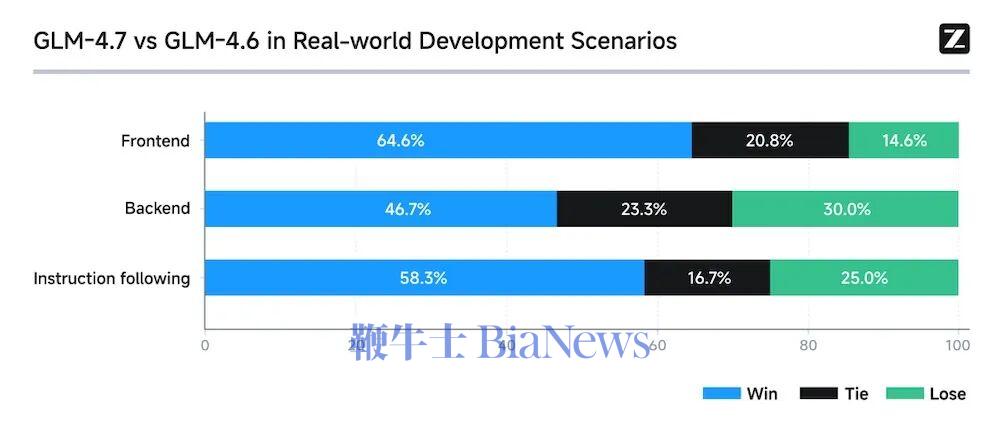 为了验证GLM‑4.7在实际开发任务中的表现,智谱对比测试了100个真实编程任务,覆盖前端开发、后端逻辑以及指令遵循等三个核心方向。结果显示,在前端任务中,GLM‑4.7相较4.6版本胜率提升至64.6%,在指令遵循场景中也达到58.3%。在最具工程复杂度的后端方向,其胜率也稳定在46.7%。除了单点生成能力,GLM‑4.7还进一步强化了多技能联动能力。GLM-4.7已在Z.ai上线了全栈技能环境,它已接入全新的Skills模块,支持调用ASR语音识别、TTS语音合成、GLM‑4.6V视觉模型等多个模块进行统一调度。在多模态任务中,它既能规划路径、又能执行动作,工具之间的“调度逻辑”打通了。