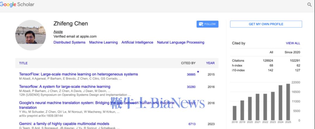 在加入苹果之前,Chen 曾在 Google 工作近 20 年(约 2005 年起)。在 Google 的时间里,他长期担任Distinguished Engineer(杰出工程师)级别,主要工作集中在机器学习系统、可扩展大规模计算架构和核心 AI 平台技术上。