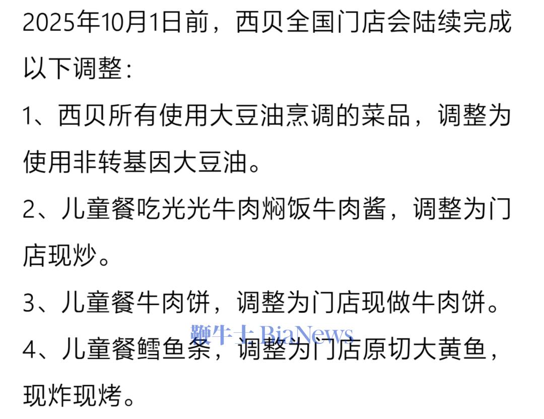 根据西贝公布的9项整改措施,大豆油被更换为非转基因油,儿童餐牛肉焖饭、羊肉串、羊排、肉夹馍等核心菜品改为门店现制。