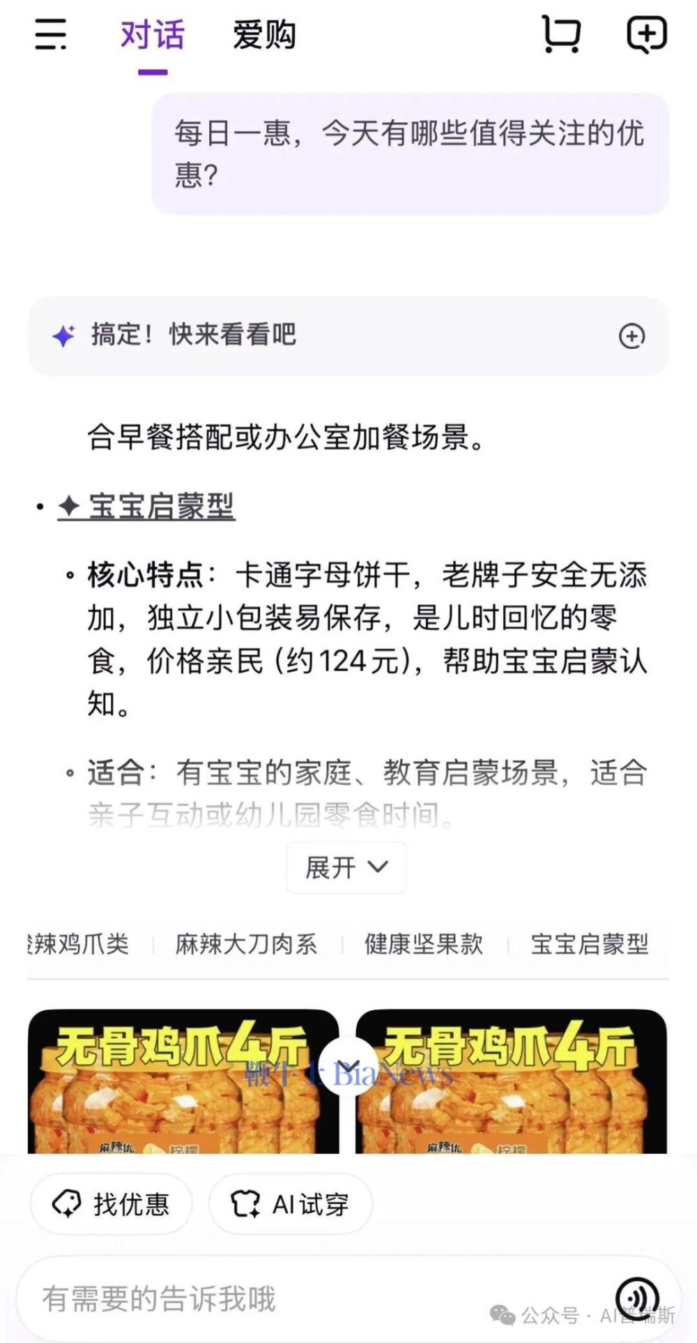 在电商APP功能越来越繁杂的今天,想简单买个东西反而变难了?今天京东新推出了“京东AI购”App,经过一下午的实测,这可能真的能成为懂我们的购物助手。打开“京东AI购”,AI这个词现在好像和聊天绑定了,具有AI功能的产品无论什么领域,都要有个对话框。不过好在,这款APP足够清爽。没有铺天盖地的大促广告,也没有复杂的层级菜单,界面核心就是一个简洁的对话框。 我试着问了一句“每日一惠,今天有哪些值得关注的优惠?”,AI反应很快,立马甩出了几组不同品类的推荐。不像传统搜索那样冷冰冰地列出一堆商品卡片,它的回复更像是一个导购员在跟你介绍:“和早餐搭配或办公室加餐场景”、“老牌子安全无添加”、“儿时回忆的零食”。 这种对话式的交互,最大的好处就是省心。你不需要去想具体的关键词,只需要像跟朋友聊天一样说出你的需求,比如“冬天防寒,加厚保暖”,AI就能get到你的点。除了直接对话,App里还有一个很有意思的板块叫“灵感空间”。这里不像传统电商那样按品类硬邦邦地分类,而是基于场景和节日来推荐。 比如最近临近元旦和腊八,“灵感空间”里就贴心地准备了“元旦将至,新年挂饰添喜气”、“腊八节,养生杂粮礼盒备起来”这样的主题。对于像我这种经常忘记节日,或者不知道送什么礼物的人来说,简直是救星。推荐的维度也很细致。想吃点零食?它会推荐“办公室小憩,便携辣味小食”或者“辣味零食好搭档,无糖气泡水”。想叫外卖?也有“烤肉,滋滋作响”或者“家常菜,妈妈的味道”这样的暖心推荐。这种基于场景的推荐,让购物变得更有温度,也更容易发现一些意想不到的好物。 网购衣服最怕什么?当然是买家秀和卖家秀的差距!“京东AI购”的“AI试穿”功能,可以说是我体验下来最“不白AI”的功能。 在App里,你可以上传一张自己的全身照,然后选择想试穿的衣服,点击“生成试衣效果”,几秒钟后,你就能看到自己穿上这件衣服的样子了。 我试了一件黑色的运动外套,生成的试穿效果非常逼真。衣服的褶皱、光影,甚至是对身材的贴合度,都处理得相当自然,虽然还是能看出高p感,但是用来购物看搭配是完全够用了。对于纠结尺码或者款式是否适合自己的人来说,绝对是一个超级实用的功能,大大降低了退换货的概率。 随着使用次数的增加,“京东AI购”的AI算法开始发力了。在浏览了一些零食之后,它给我推荐了各种口味的无骨鸡爪、大刀肉,甚至还有小时候爱吃的字母饼干。这些推荐真够精准,但是价格...也真的很京东,比如221元的酸辣无骨鸡爪,或者56元的一箱大刀肉。对于有娃家庭,它也会推荐乐高积木、婴儿胎帽、床围栏等实用的母婴用品。这种千人千面的个性化推荐应该是师承京东平台,打开App能直接看到感兴趣的东西,而不是一堆无关紧要的广告。“京东AI购“砍掉了传统电商繁琐的流程,用AI对话和场景化推荐重构了购物体验。 如果你也厌倦了传统电商App的复杂操作,或许“京东AI购”能帮你做减法。(转载自AI普瑞斯)