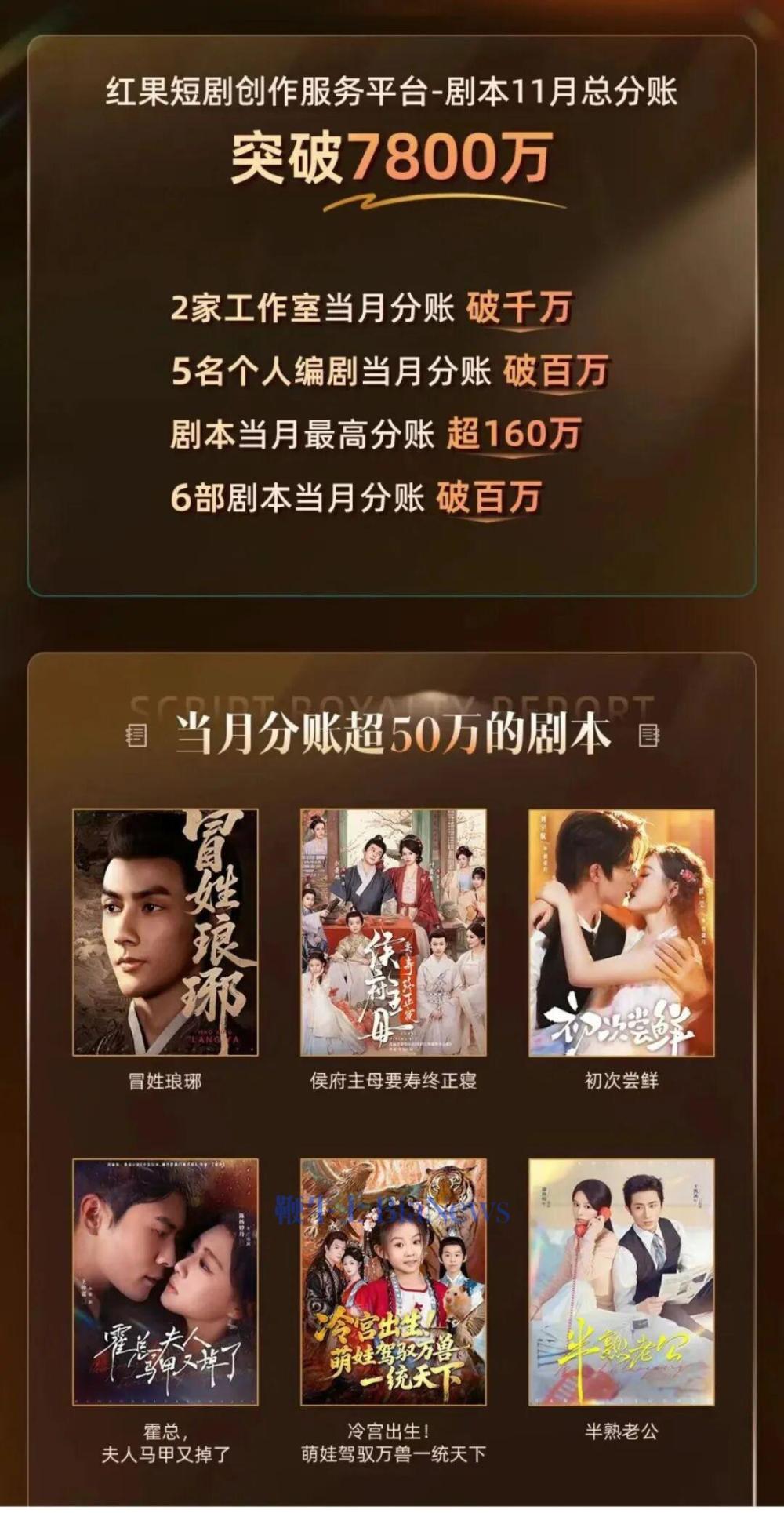 以红果为例,其在今年大幅提升分账政策以激励编剧、演员、承制等。其中,剧本分账总额从4月的4000万元攀升至11月的超7800万元。11月,红果首次对外公布了演员分账预估数据,三位演员单剧预估分账超100万。