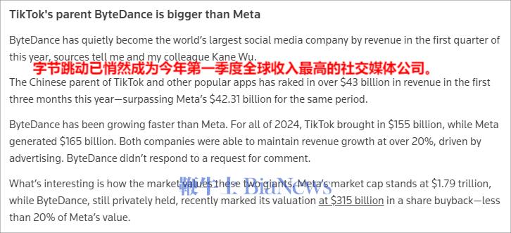 先是 2025 年 7 月,外媒报道今年前三月,字节跳动收入超过 430 亿美元,首次超过 Meta 同期的 423.1 亿美元,成为 2025Q1 全球收入最高的社交媒体公司。