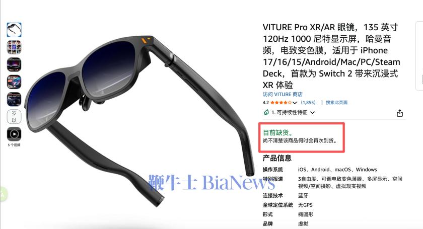 市象观察线上销售平台发现,截至12月27日,在亚马逊德国站点搜索“VITURE Pro”显示“目前缺货,尚不清楚何时会再次到货”,但Luma系列产品仍在售。同时VITURE Pro、Luma系列在亚马逊欧洲其他地区均处于在售状态。