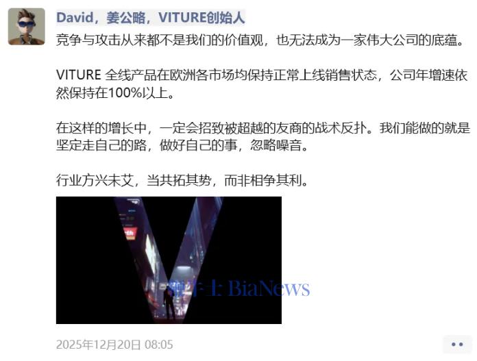 隔天20号,VITURE创始人兼CEO姜公略率也在朋友圈发文回应该事件。