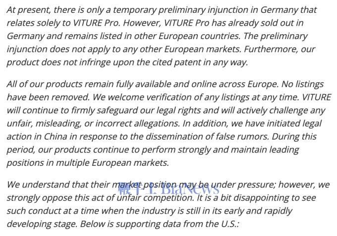 国内有媒体称当时就裁定结果以及经销商的说法向VITURE官方求证,得到的回复是:“You can always purchase our product on viture.com or on Amazon. Our product should not be banned from Germany.(您始终可以在viture.com或亚马逊上购买我们的产品。我们的产品不应该在德国被禁止。)”