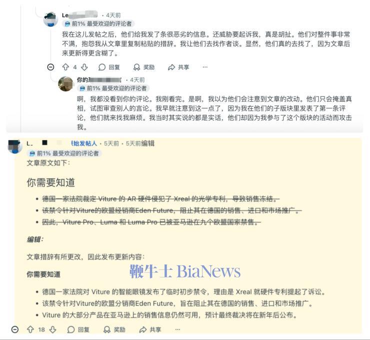 在社交平台reddit上,一位网友贴出了Android Central原报道截图,并称“自己在reddit上引用这家媒体的报道内容发帖后,遭到VITURE方投诉”,这位网友建议VITURE去找原作者。