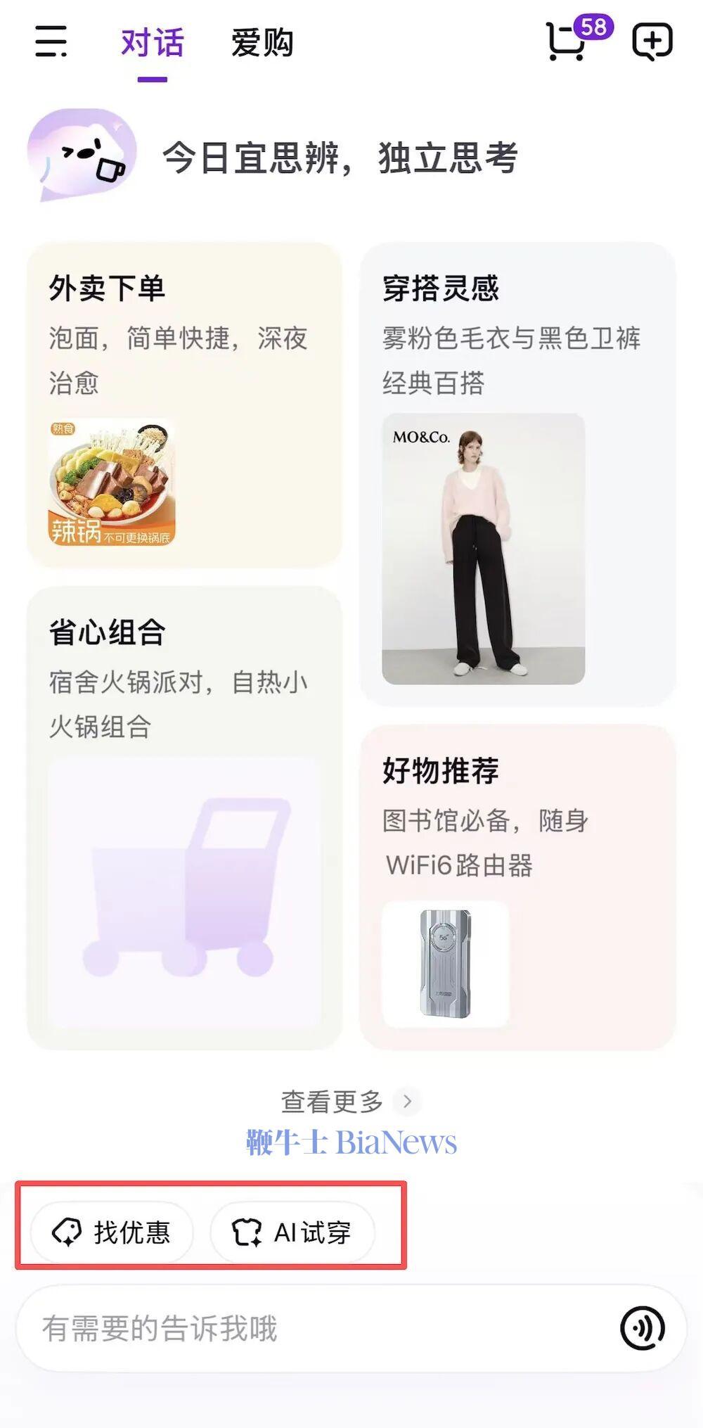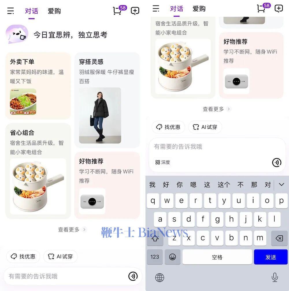 12月29日报道,上周五,京东低调上线了一款AI原生应用——“京东AI购”。这款集外卖点单、商品导购、AI试穿等核心功能于一体的应用,已登陆App Store,目前处于内测阶段,输入邀请码才能体验。从整体定位来看,京东AI购更像是一个“会思考、能购物、关心你”的AI生活助手。据了解,这款应用的底座是京东自研的“言犀大模型”,自然语言理解、商品识别能力和“AI试穿”的功能都由它驱动。智东西已获取邀请码并进行实测。与传统电商App依赖浏览和筛选的操作不同,“京东AI购”以对话为主要交互方式,用户只需说出“我想吃红烧排骨”或“帮我找一台鼠标”,系统便会直接推荐商品或服务,解锁了AI按需找货的新体验。值得一提的是,这也是继美团今年9月推出“小美”后,又一款大厂出品且以AI为内核的生活服务类应用走入大众视野。