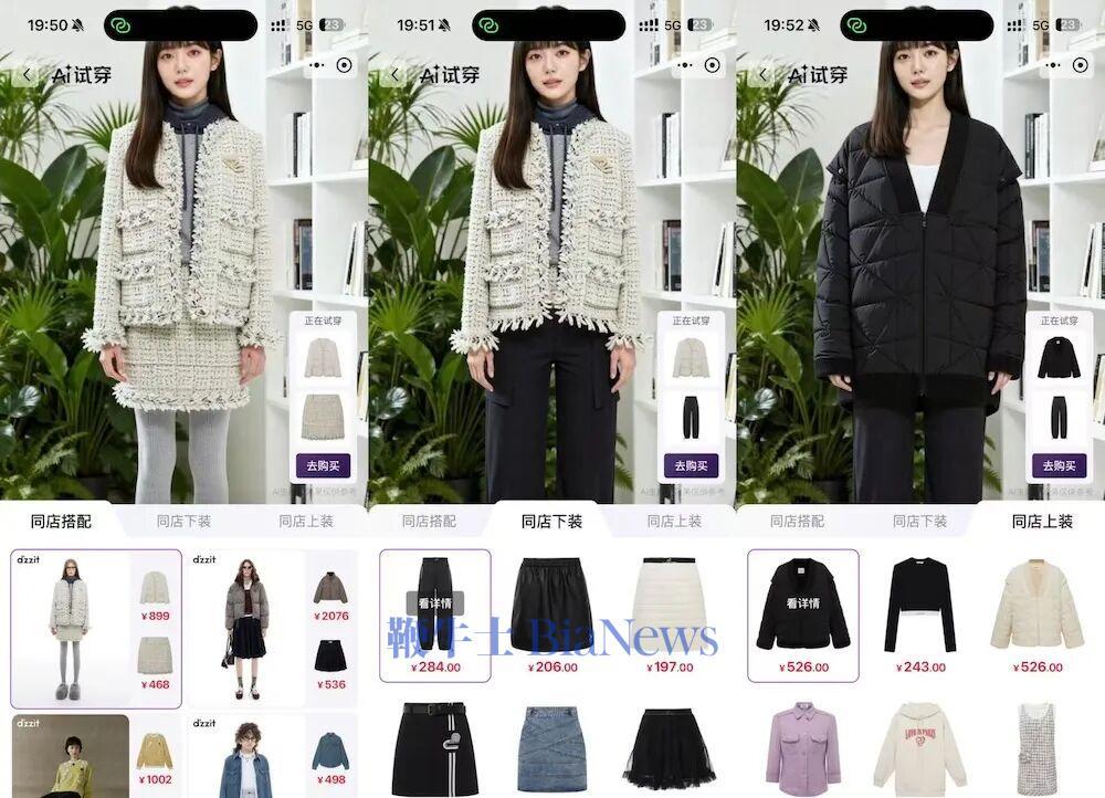 我在体验中发现,无论是“对话”界面还是“爱购”页面,底部都保留了一个输入栏,支持用户随时用自然语言调起AI对话。但在“对话”界面,这个输入栏上方还额外设置了两个快捷入口:“找优惠”和“AI试穿”。其中,“找优惠”和“每日一惠”的界面是一致的。作为当前版本中突出呈现的AI功能之一,“AI试穿”在互动体验和视觉效果上都颇具亮点。为此,我特别体验了“AI试穿”功能:选择品牌店铺、挑选一套穿搭并上传照片后,系统便生成了试穿效果图。上传了一张AI生成的人像后,系统能准确识别体型并渲染衣物。试穿结果展示在中心区域,右侧提供“去购买”按钮。下方则展示“同店搭配”、“同店下装”、“同店上装”三类扩展推荐,价格和详情均可点击查看。试穿效果图渲染速度较快,并且AI试穿功能的搭配相对灵活,上下装可以不成套,自由组合,确实提升了用户的尝试空间与搭配趣味性,也在一定程度上规避了网购“无法试穿”的障碍。但当前版本的“AI试穿”仍限制在同店商品范围内,影响了跨品牌搭配的可玩性。随着未来版本的更新,“AI试穿”若能够支持跨店混搭,实用性也会更高。