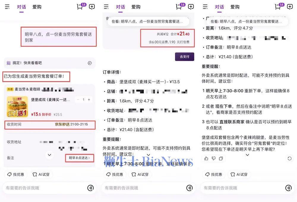 我先输入:“帮我点一杯常点的奶茶”。AI果然识别出了我此前经常下单的门店,并生成下单链接,支持跳过详情页直接支付,整体体验效率不低。但也出现了一个小瑕疵:推荐的饮品品类与我常点的不完全一致,包括糖度、冷热选项在内,也未精准命中。如果把范围放宽一点,比如输入“帮我点一杯咖啡”,AI也能帮忙多凑一杯一起下单,生成组合订单。随后,我再试了一个需求更复杂的场景,输入:“明早八点,点一份麦当劳穷鬼套餐送到家”。AI能识别出“送达时间”,但并未成功设置,仅在备注一栏标明送达时间。此外,AI对“穷鬼套餐”的理解还有偏差,它将其理解为价格较低的套餐选项,而不是大家常说的“随心配”组合。虽然推荐内容仍算合理,但6元的配送费占了商品价格的一半,性价比并不算理想。在传统外卖平台上,送达时间的设定通常更为灵活,不仅支持尽快送达与定时送达的选择,部分商家还支持跨天预约,这一点在功能完备性上仍优于当前AI助手的实现。