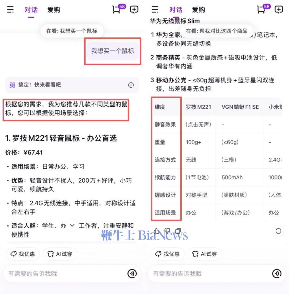 切换到商品选购场景,我试了下“我想买一个鼠标”,AI推荐了几款不同类型、不同价位的鼠标,并附带选购建议。更实用的是,它还提供“商品对比”功能。点击后,系统会在“静音效果、重量、连接方式、续航能力、握感设计、适用场景”这六个维度生成对比表格,让用户在风格偏好之外,也能做出更理性判断。相较以往需要多页切换、手动比价的购物流程,这种展示的方式明显更省事。同时我也注意到,推荐的几款鼠标价格都偏平价,也反映了AI对用户消费习惯的初步判断。整体来看,京东AI购在自然语言理解和操作上已经具备一定的实用性,能听懂主流需求,也能给出相对合理的反馈。但面对一些带有网络语境或模糊意图的表达,它的“理解力”还有成长空间,距离真正的“万能管家”仍有不小距离。