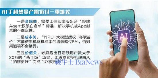 李锦堤认为,新一代AI手机的发展是趋势,但想量产,需要迈过三重难关:一是合规关,需要工信部牵头出台“终端Agent权限白名单”标准,解决手机被App封禁的不确定性;二是成本关,“NPU+大模型授权+内存溢价”不能使手机整机成本的增幅超过8%,否则渠道端不会接受;三是价值关,必须跑出日活跃用户数大于30万的“杀手级”场景,让消费者换机理由从“拍照更好”变成“办事更快”。这三关一过,AI手机才会从“Demo”变成“现金流”。(转载自证券时报)