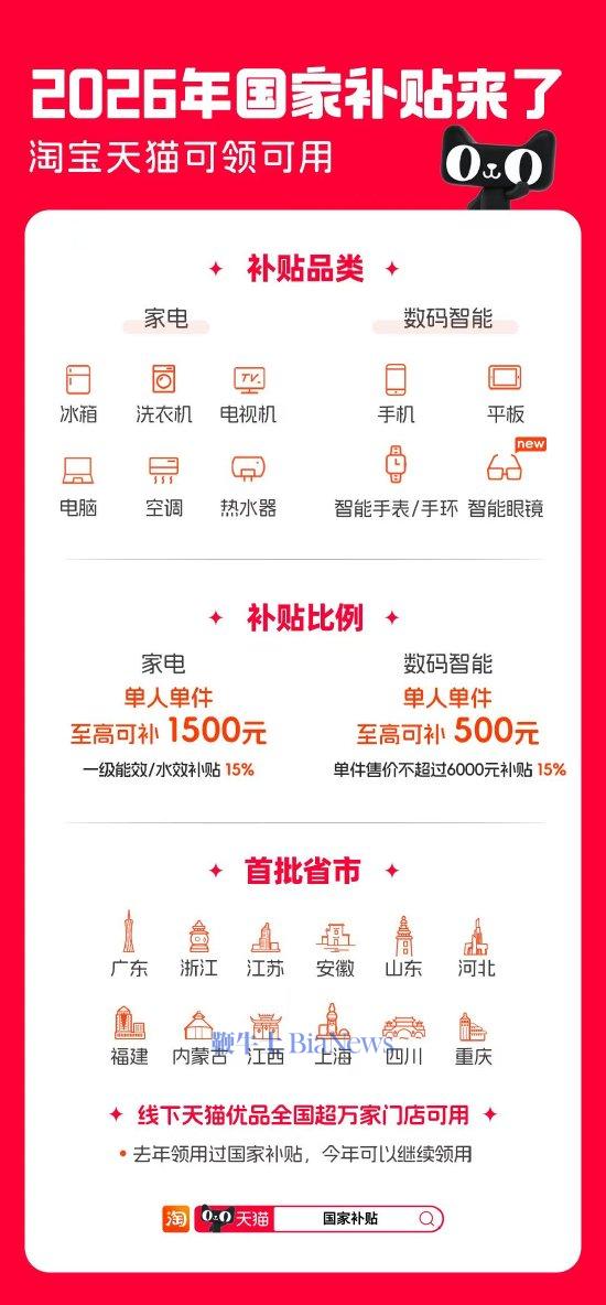 目前,广东、浙江、江苏、安徽、福建、内蒙古、江西、上海、四川、山东、河北、重庆等省市国补率先上线淘宝天猫,消费者在淘宝APP首页‘国补’频道或者搜索‘国家补贴’即可领用。天猫线上线下全面承接2026年国补,线下天猫优品全国超万家门店也支持领用国家补贴。
