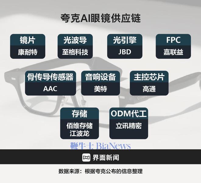 既然说到 AI 眼镜这了,托尼也想顺便提一嘴,其实这个火热的赛道也是供应链企业的百花齐放 —— 就单拿前两天广告投到飞起的夸克眼镜来举例子,除了麦克风是来自瑞声,剩下镜片是康耐特、光波导是至格,最后由立讯精密做 ODM 代工。