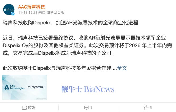 这一买直接补齐了 AR/XR 上的技术短板,再加上瑞声原本就拥有的全球客户基础和供应链资源,这不得杀疯了?