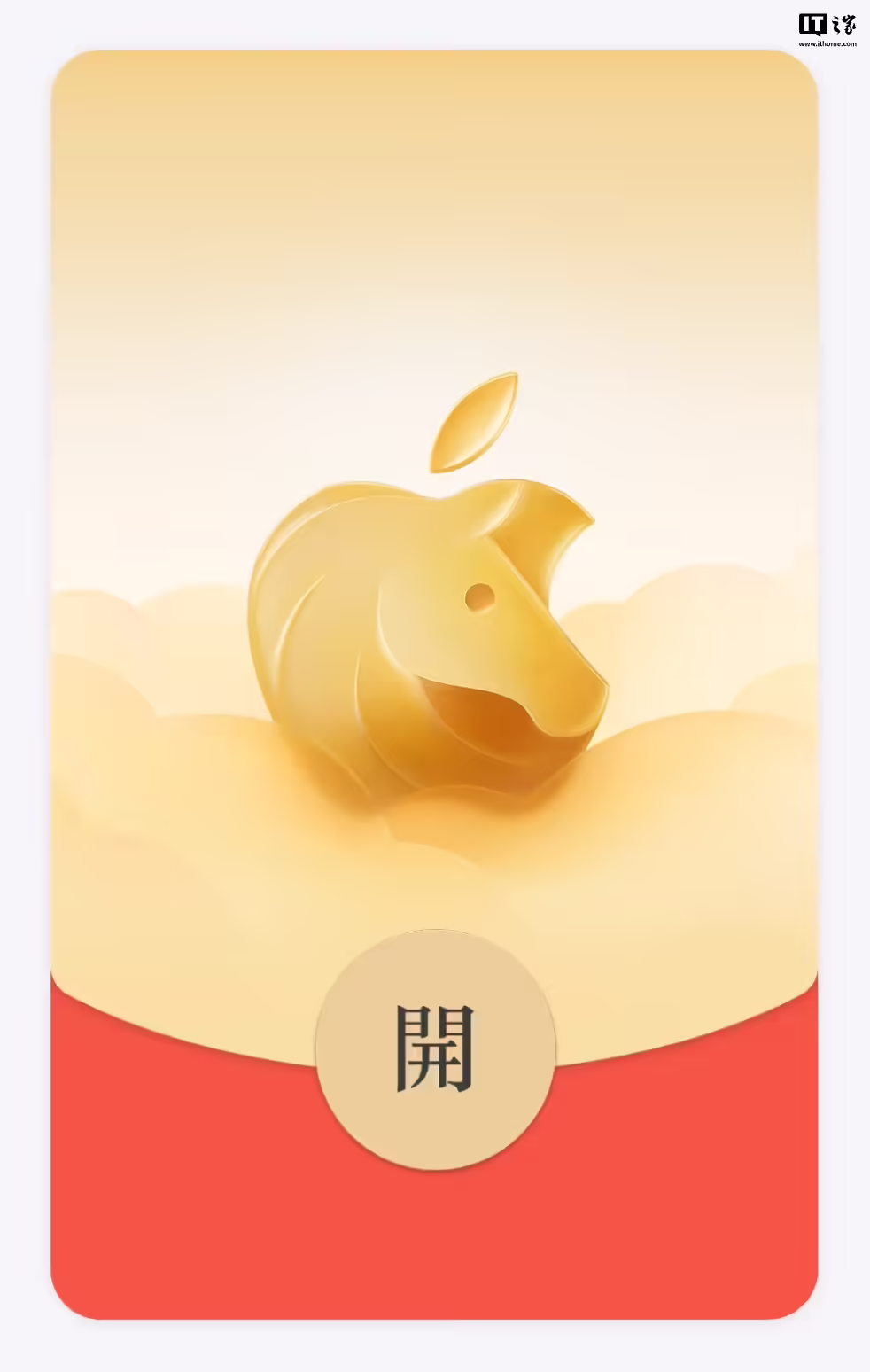 1 月 6 日消息,为庆祝 2026 年马年农历春节(2 月 17 日为初一),苹果在微信上线了红包封面,有效期 3 个月,截至IT之家发稿仍可领取,同时,苹果还推出了新年壁纸,提供 Mac / iPad / iPhone / Apple Watch 多个尺寸。