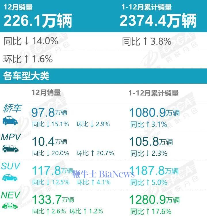 据中国汽车流通协会乘用车市场信息联席分会最新销量数据统计,2025年12月份国内狭义乘用车市场零售销量达226.1万辆,同比下降14.0%,环比增长1.6%;1-12月份累计销量2374.4万辆,同比增长3.8%。
